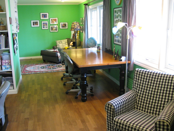 This is much more fun to sew, scrapbook, and do homework in, than the peachy walls, with mauve carpet was. We pulled up the carpet , and this nice hardwood floor was underneath. That was a very pleasant surprise. The table was blue, and was our kitchen table at our old house. We put down plastic, and spray painted it in this room. Not a good idea! The cleanup didn't take that long, but it was a mess. What was I thinking? I didn't want to wait for my sons to get home and move it outside for me, that's what. We bought the gingham chair at Ikea, and I made the curtains out of inexpensive gingham fabric and a light-blocking backing fabric. I found the rug at a thrift store.